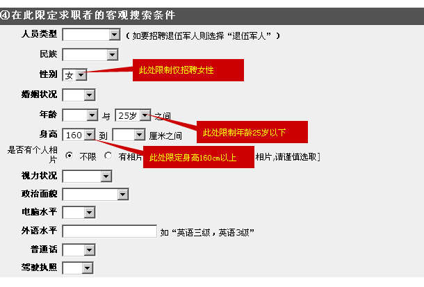當前位置:信息>> 怎樣設定多個條件(如同時限制性別、年齡、身高)進行人才搜索