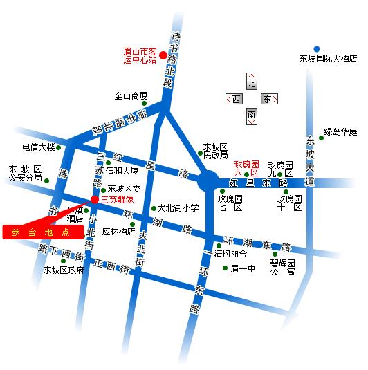 乘車路線:在眉山市客運(yùn)中心站乘3路、14路、7路車直達(dá)
